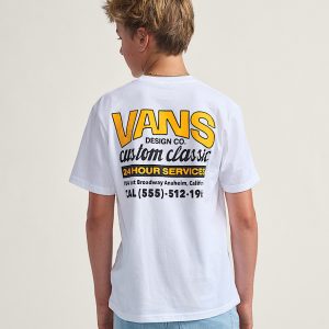 The Vans® legacy gets its moment in the sun on the Big Kids Shop Front T-shirt, with short sleeves for casual, everyday style. A graphic of a Vans® logo on sits on the front, with a retro storefront ad of the factory's address on the back–both screen printed for long-lasting wear.
