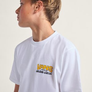 The Vans® legacy gets its moment in the sun on the Big Kids Shop Front T-shirt, with short sleeves for casual, everyday style. A graphic of a Vans® logo on sits on the front, with a retro storefront ad of the factory's address on the back–both screen printed for long-lasting wear.