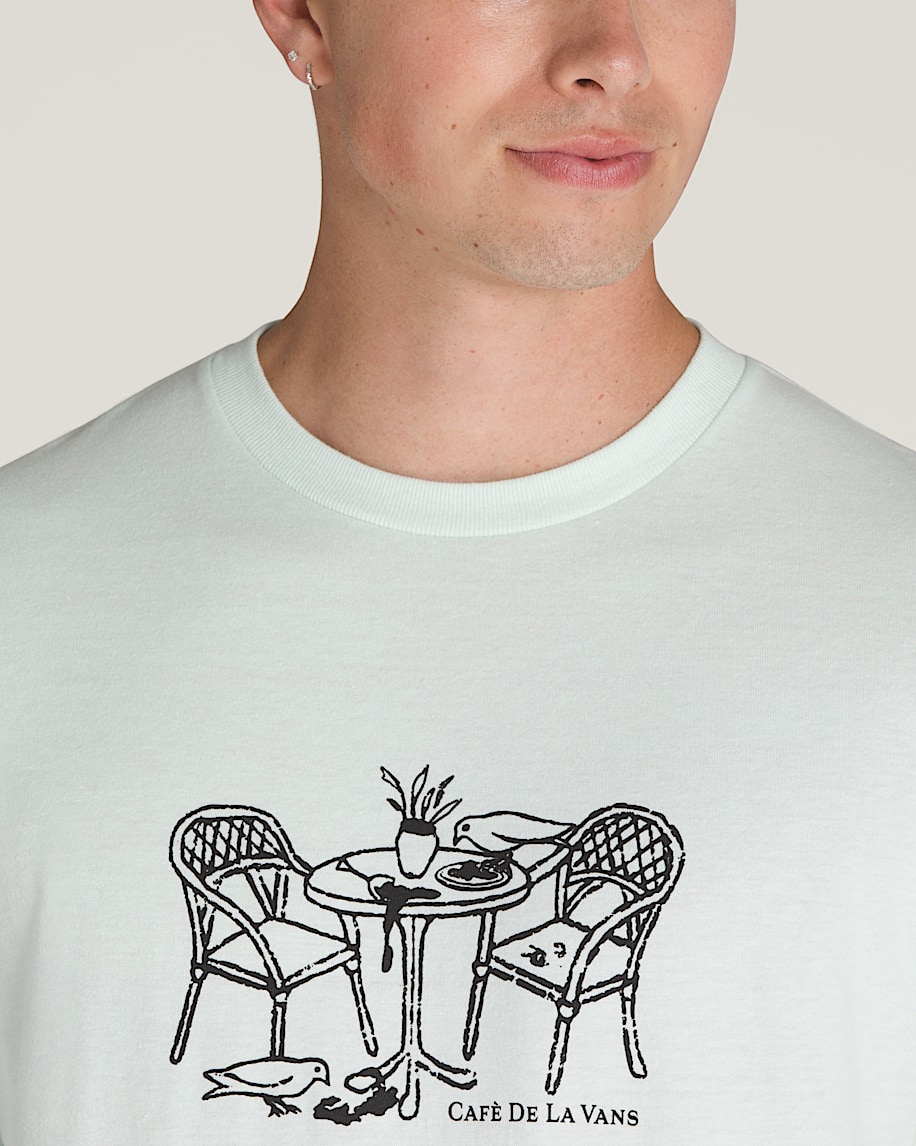 Take five in the Café De La Vans T-Shirt, a classic fit short sleeve crew neck T-shirt with a screenprinted graphic on the front of a scene from an outdoor cafe, Vans® style.