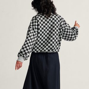 Allover checkerboard printPullover crew designRibbed collar, cuffs, and hemSoft midweight fleece100% cotton