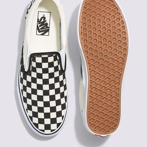 Iconic Slip-On shoeWide constructionLow profile canvas uppersClassic checkerboard printSupportive padded collarsElastic side accentsSignature rubber waffle outsoles