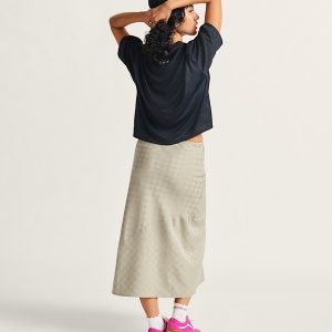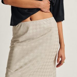 With a flattering bias cut panel and side slit that allows for easy movement, the Diana Column Checkerboard Skirt offers an elevated take on a retro style with a satiny charmeuse fabric featuring a subtle woven check print.