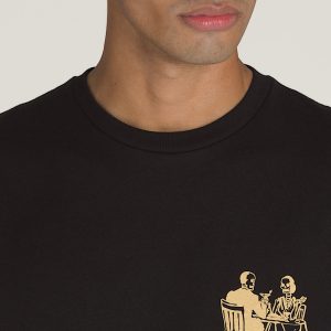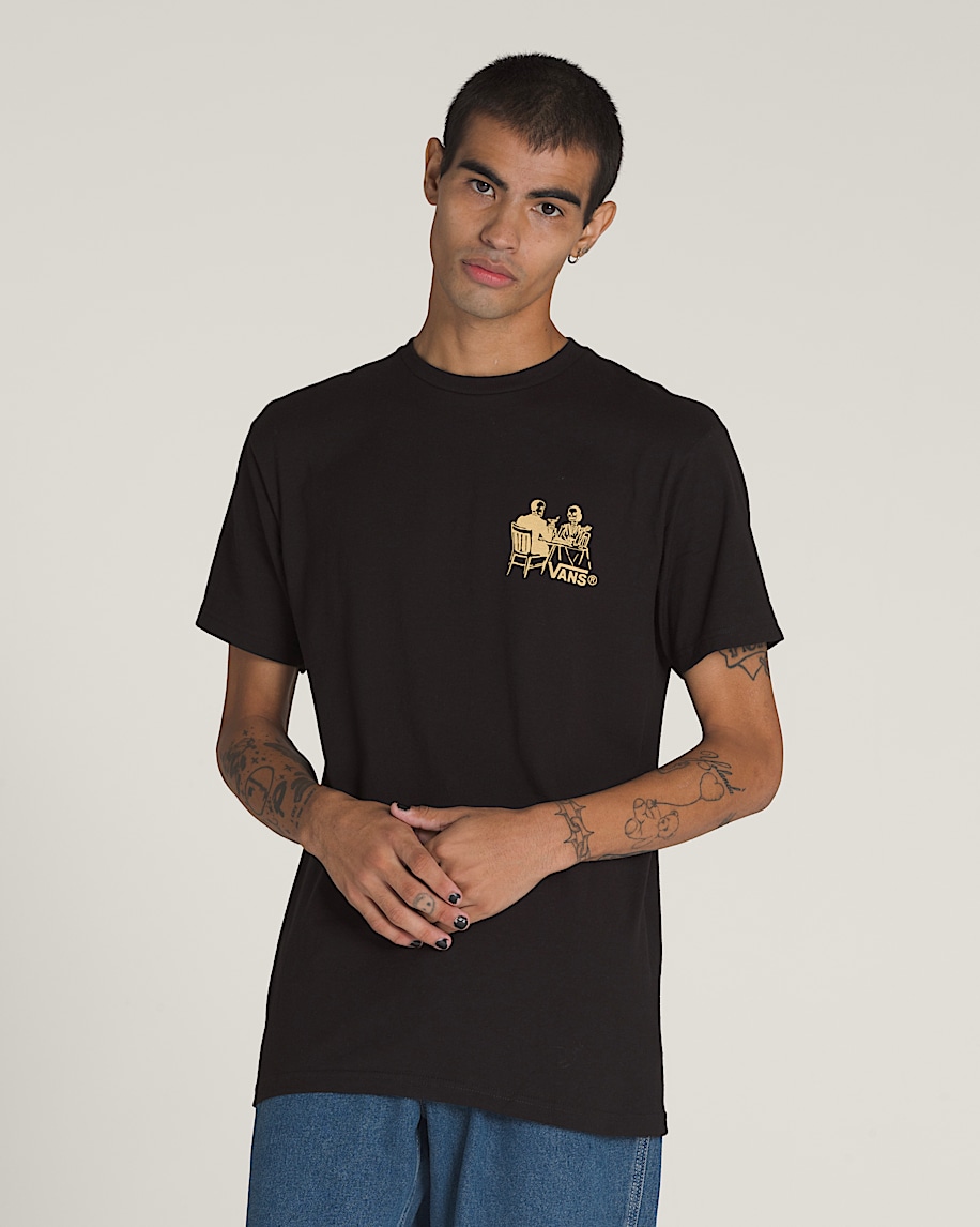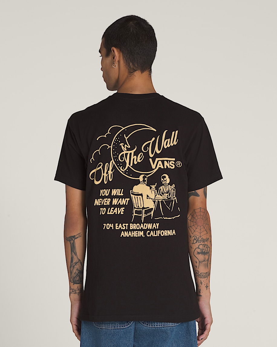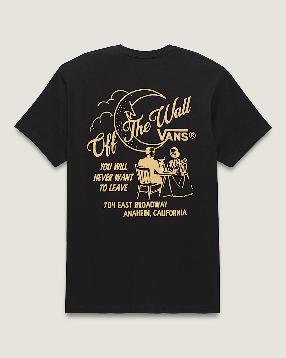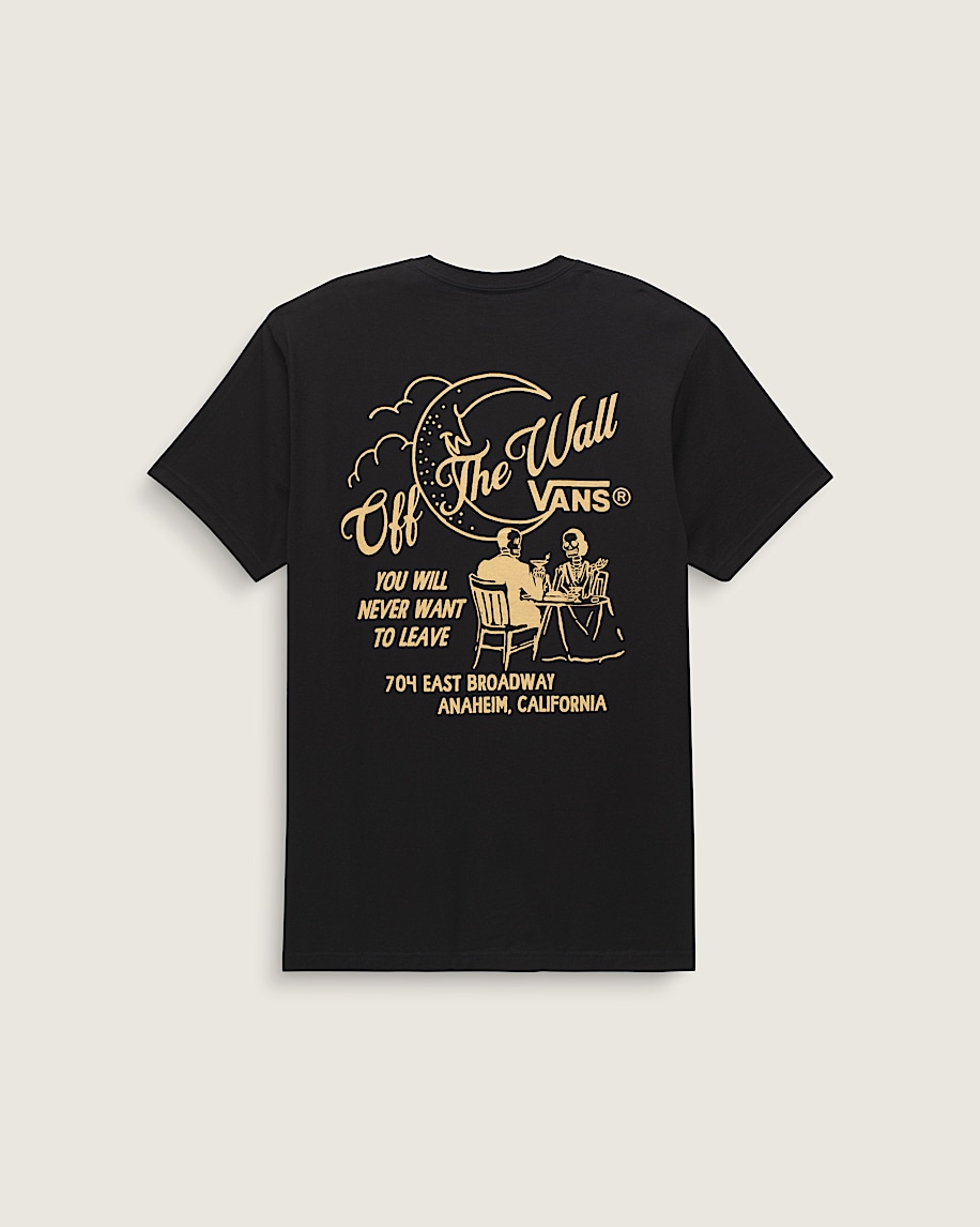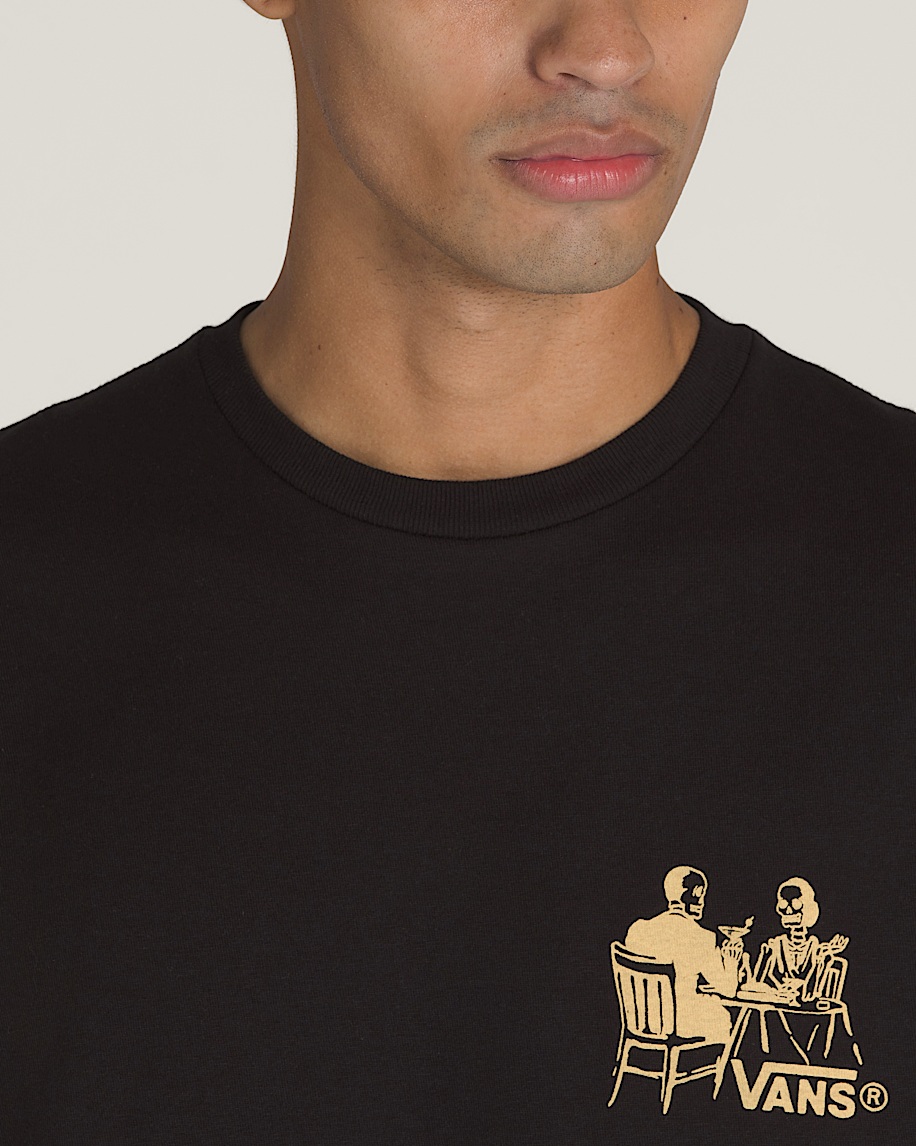 Get fancy in the Fine Dining T-Shirt, a classic fit short sleeve crew neck T-shirt with screenprinted graphics of skeletons having a meal atop the Vans® logo on the front, and a larger graphic of the same moonlit scene on the back.