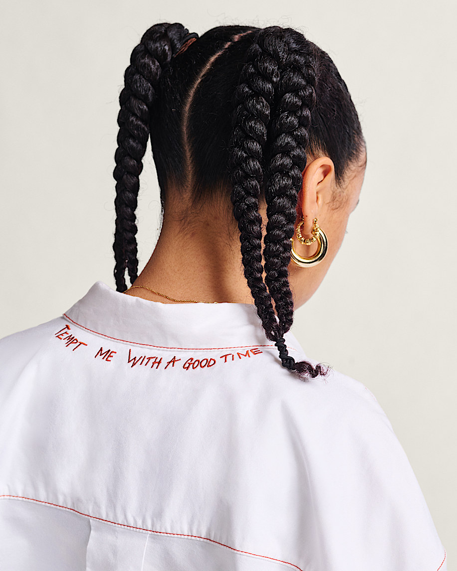 Long sleeve button up Oxford-style shirtRaw hem with contrast top stitchingEmbroidered details at center back neckOversized fit for an ultra-relaxed feel100% cotton