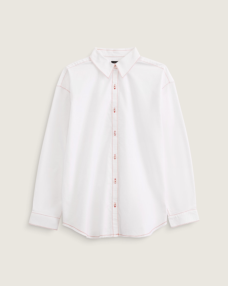 A wardrobe staple with a streetwear edge, the Gillian Button Up Shirt is a modern take on the Oxford style that exploded in popularity in the U.S. back in the 50s. The Vans® version features a raw hem and contrast top stitching, all in a roomy, oversized fit.