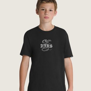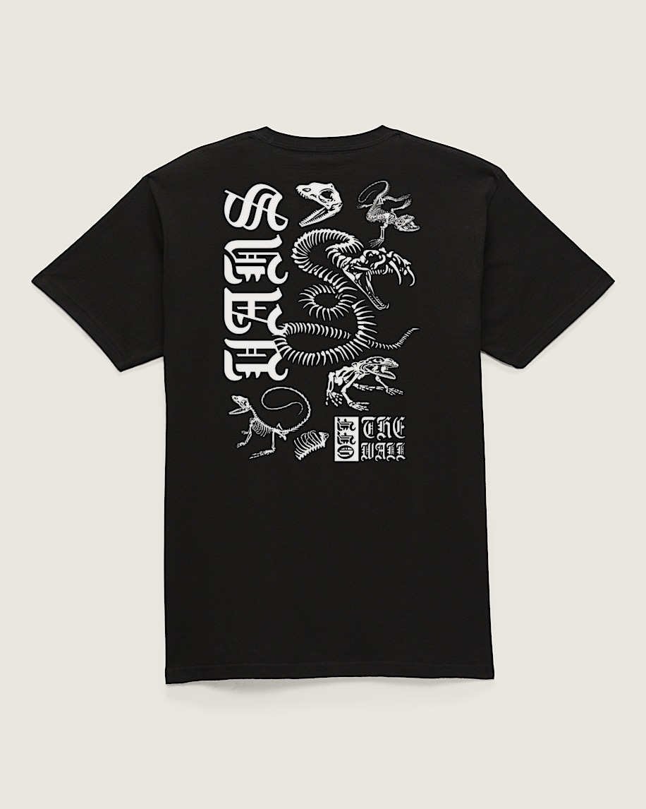 Crewneck shirt for a classic lookCarded ringspun fabrication for a softer, smoother shirtGlow-in-the-dark screen printed graphicDinosaur bone illustrations with custom Vans typeTagless neck for a smooth feelShort sleeve with standard kids fit100% cotton