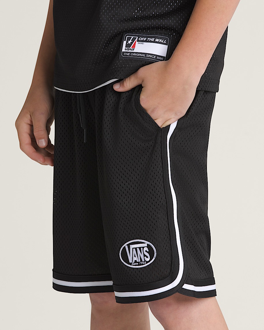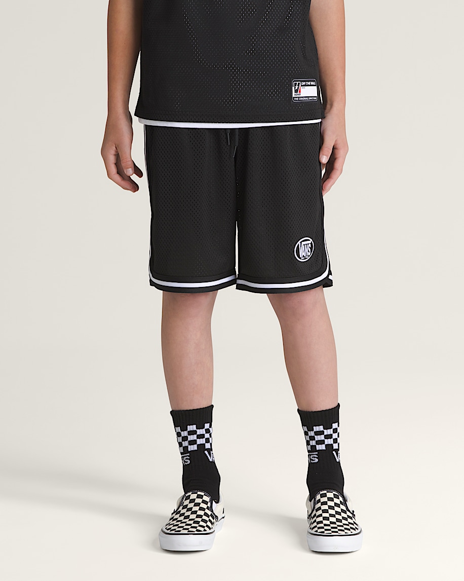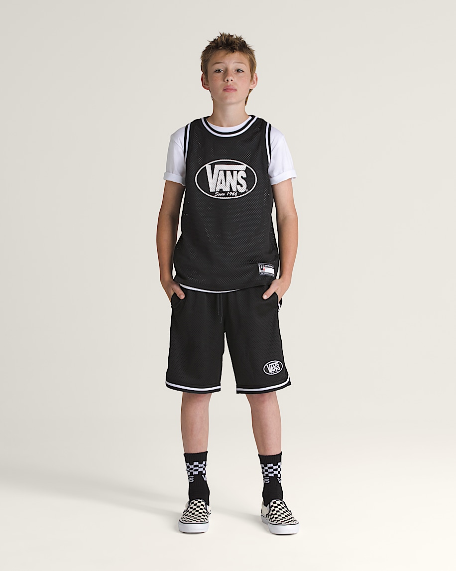 Make a slam dunk in the Kids Classic Oval Loose Basketball Shorts, a roomy pair of shorts made for play with contrasting jacquard striping and a screenprinted graphic of a Vans® logo at the front hem.