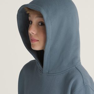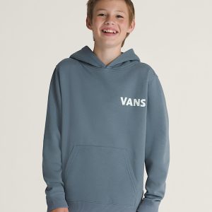 The Kids Headwaves Pullover Hoodie is a classic pullover hoodie made of warm and cozy brushback fleece. It also features ribbed details with a screenprinted graphic of a Vans® logo on the front, and a larger graphic of a skull breaking through a checkerboard ring with a Vans logo on the back.