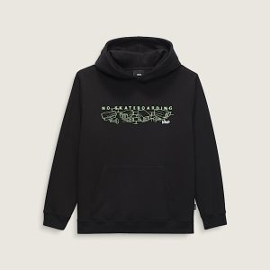 The Kids Night Watchers Pullover Hoodie is a classic pullover hoodie made of cozy brushback fleece. It features a kangaroo pocket, ribbed details, and a screenprinted graphic of ever watchful security cameras atop a Vans® logo on the front.