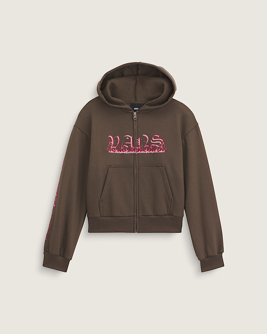 Turn up the heat in the Big Kids Vans Inferno Zip Hoodie, with screen print artwork for long-lasting design featuring a flaming Vans logo on the chest, and a streak of fire up one sleeve. A soft brushed interior offer comfort and warmth, while long sleeves give added coverage. A full-length front zipper allows for adaptability.