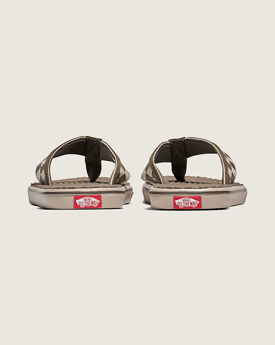 Classic Vans shoe inspired SandalSoft rubber and stretch textile liningsNylon toe pieceSynthetic Nubuck strapsLightweight, flexible, and durable UltraCush™ Lite waffle outsolesSubtle waffle pattern on the footbedCheckerboard branding is unmistakably VansMade with water-based inks and glues