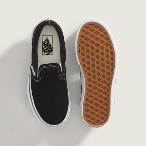 Vans #98 was introduced in 1979, but the Classic Slip-On has come a long way. Black Slip-On sneakers don't come more stylish and spectacular than this. The low-profile canvas uppers, supportive padded collars, and rubber waffle outsoles take care of the comfort. All that remains is to slide in and hit the road. Vans beloved Slip-On sneakers provide convenience and comfort in equal measure. A Slip-On sneaker made for kids in the modern world? Look no further.