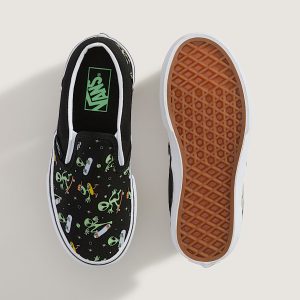 Iconic slip on shoe made for kidsGlow-in-the-dark alien print adds extra funLow profile canvas uppersSupportive padded collarsElastic side accentsSignature rubber waffle outsoles