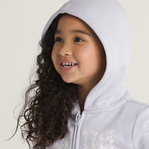 The Kids Daisy Break Zip Hoodie is a classic zip front hoodie with pockets in a slimmer fit. It also features ribbed details with a graphic of a Vans® logo made of daisies on the front.