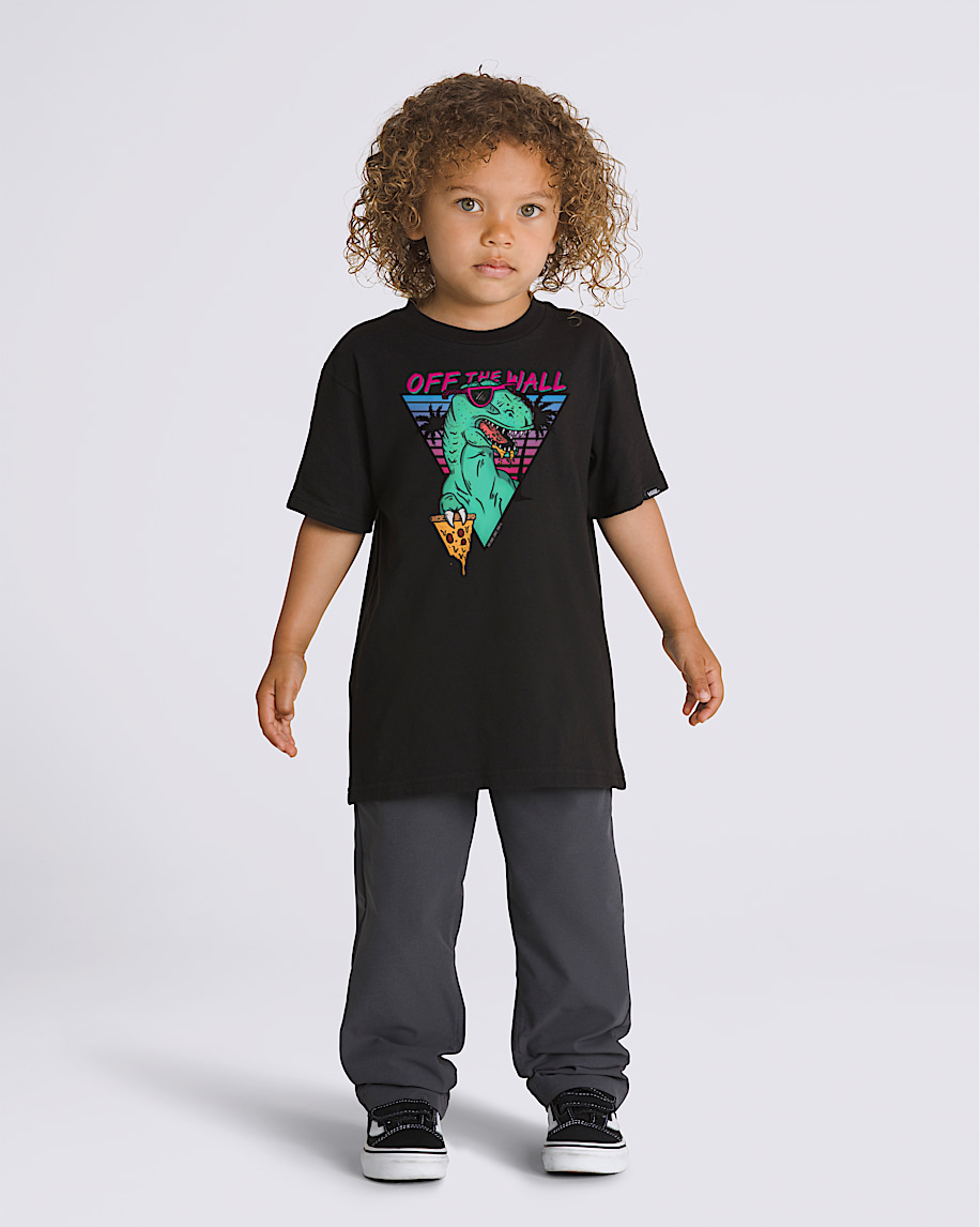 The Little Kids Dina Za T-Shirt is a short sleeve crewneck tee made from a heavier weight cotton and features a dinosaur graphic.