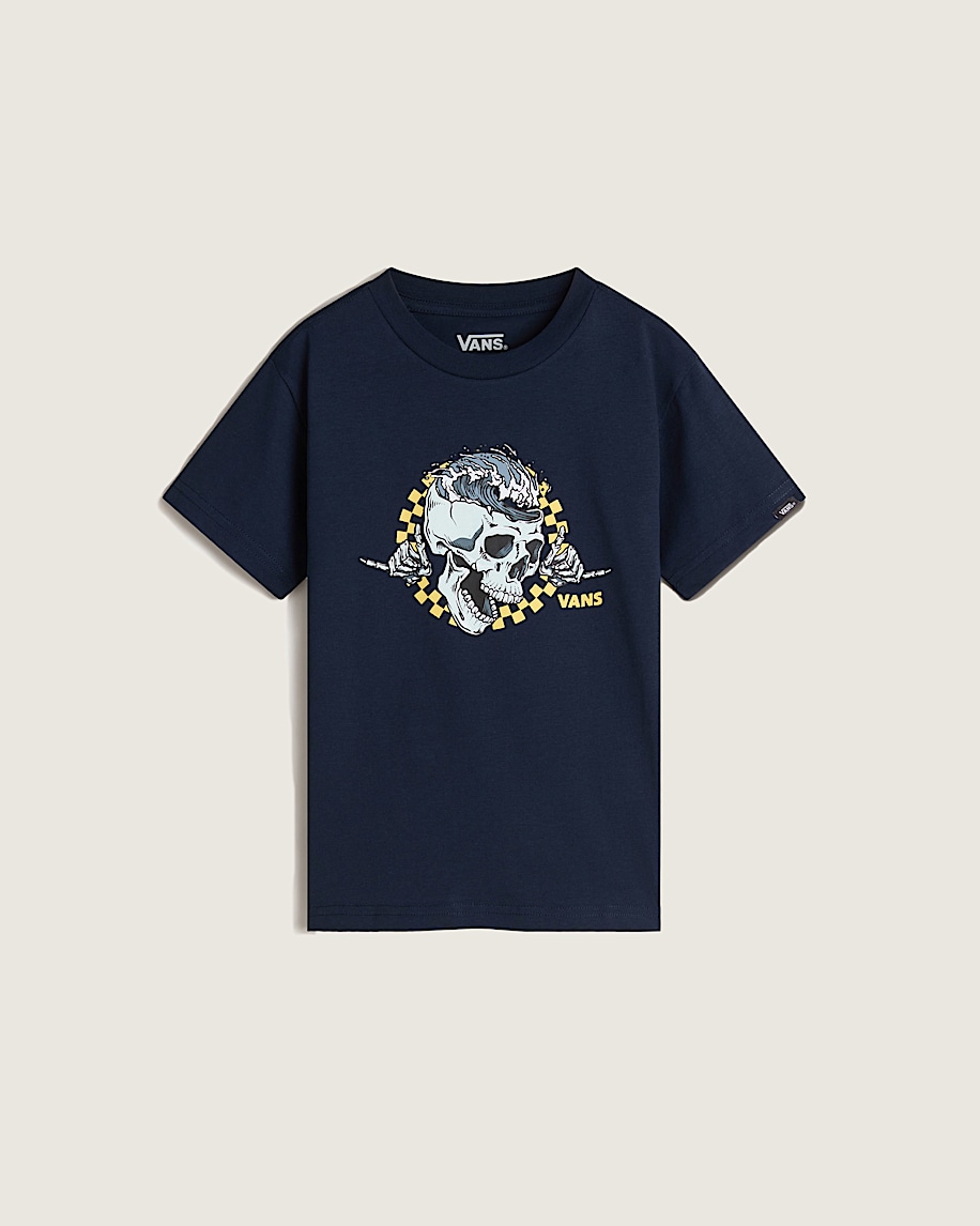 Break out in the Little Kids Headwaves T-Shirt, a short sleeve crew neck T-shirt. Featuring carded ringspun fabrication for a softer, smoother shirt, it also showcases a graphic of a skull breaking through a checkerboard ring with a Vans® logo beneath.