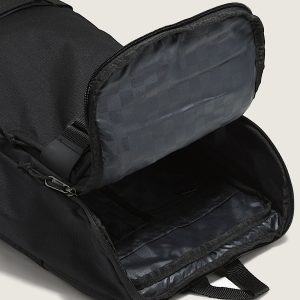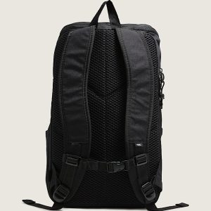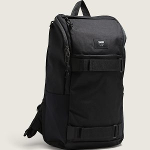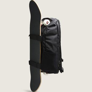 Main zippered compartment holds everyday gearSmall top front zip pocket for quick-grab itemsLined media pocket protects electronicsInternal sleeve fits laptops up to 15"Internal organization system keeps things sortedWater bottle pockets fit most bottlesSkateboard straps secure your board when not ridingErgonomic, padded shoulder straps for comfortAdjustable sternum strap adds stabilityWaffle mesh back panel improves airflowDimensions: 18" x 11" x 6"Capacity: 23 litersShell: 100% nylon with polyurethane coatingLining: 100% polyester with polyurethane coating