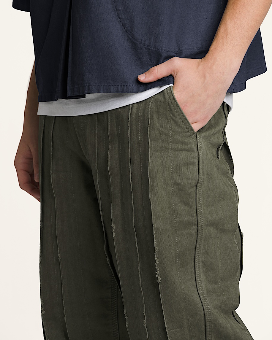 All over deconstructed pleatsFront button closureButton tabs on waist for an adjustable fitFront hand pockets and back welt pocketsPremium cotton construction for durability and comfort