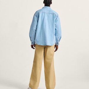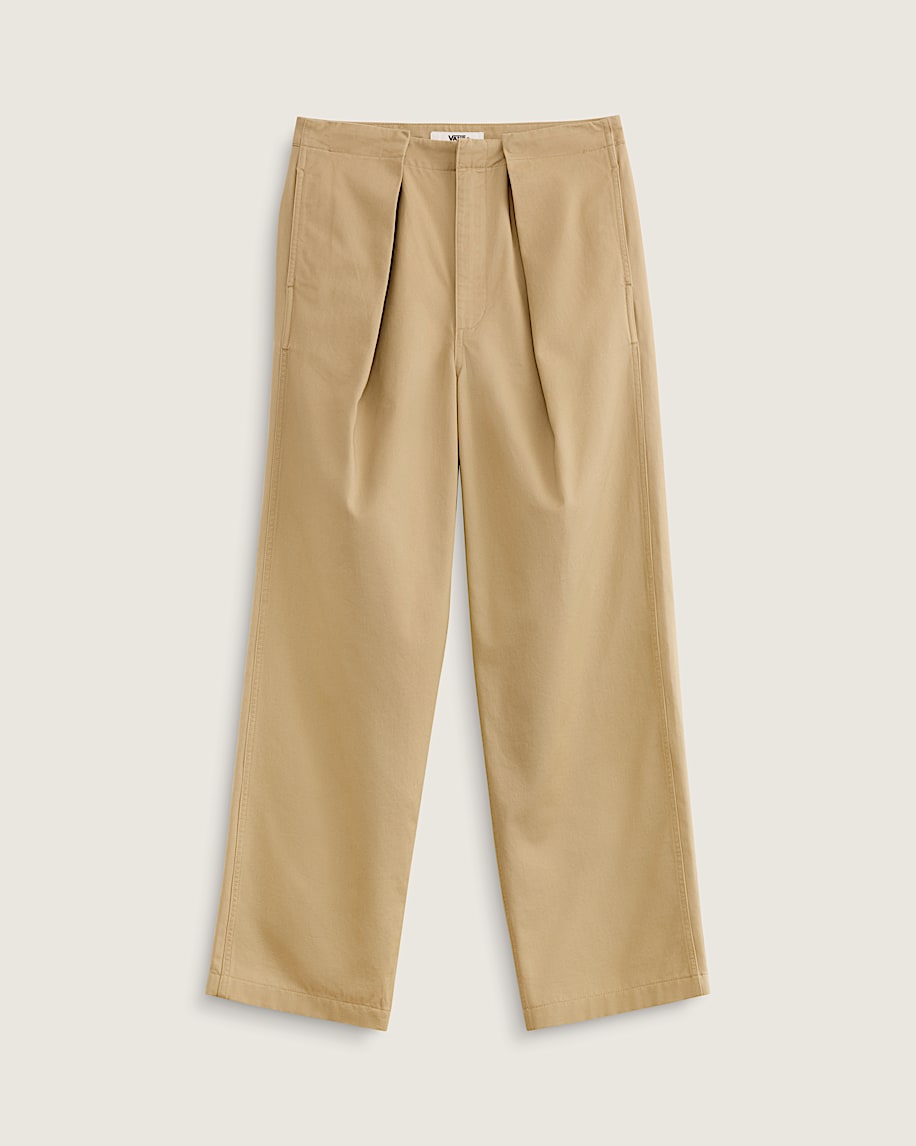 Material: 100% CottonWide leg chino pant with an adjustable pleat detail at the front waistInterior woven labelBaggy fitRaw edge detail at the hem and sleevesGrant is 62.5 and I swearing a size 30Haro is 59 and is wearing a size