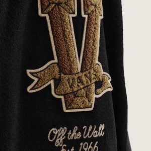 Material: 60% Polyester, 30% Wool, 1% NylonWool stadium jacket with polyurethane contrast sleevesYarn dyed stripe ribbingPatch details at the left chest and right sleeveTonal checkerboard satin liningInterior woven labelLoose fitGrant is 6'0" and is wearing a size MHaro is 5'9" and is wearing a size S
