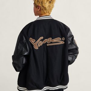 Material: 60% Polyester, 30% Wool, 1% NylonWool stadium jacket with polyurethane contrast sleevesYarn dyed stripe ribbingPatch details at the left chest and right sleeveTonal checkerboard satin liningInterior woven labelLoose fitGrant is 6'0" and is wearing a size MHaro is 5'9" and is wearing a size S