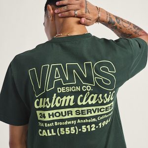 Wear a piece of Vans history in the Shop Front T-Shirt, paying homage to the company's first factory. This classic fit short sleeve crew neck T-shirt features a Screenprinted graphic of a Vans® logo on the front, with a retro storefront ad of the factory's address on the back.