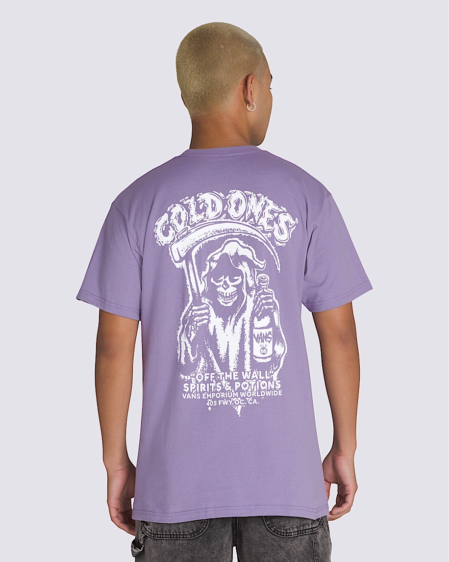 The Skull Reaper Spirit World T-Shirt is a classic fit short sleeve crew neck T-shirt with a screenprinted graphic of the Vans® logo on the left chest, and the grim reaper with a cold one on the back.