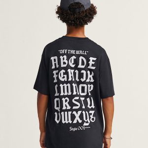 With short sleeves for a casual, everyday style, the Style 001 T-shirt will instantly become a wardrobe top ten. Long-lasting screen printed graphics featuring a stylized Vans logo on the front and an Off the Wall scripted alphabet chart on the back add a streetwear edge to a classic silhouette.