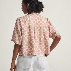 Checkerboard print with sun graphic detailFront button placketLay-flat collarLeft chest pocket100% viscose