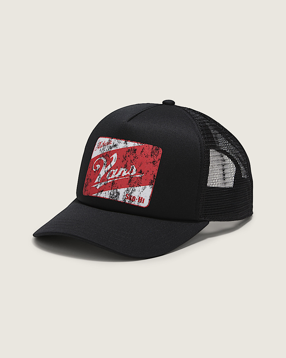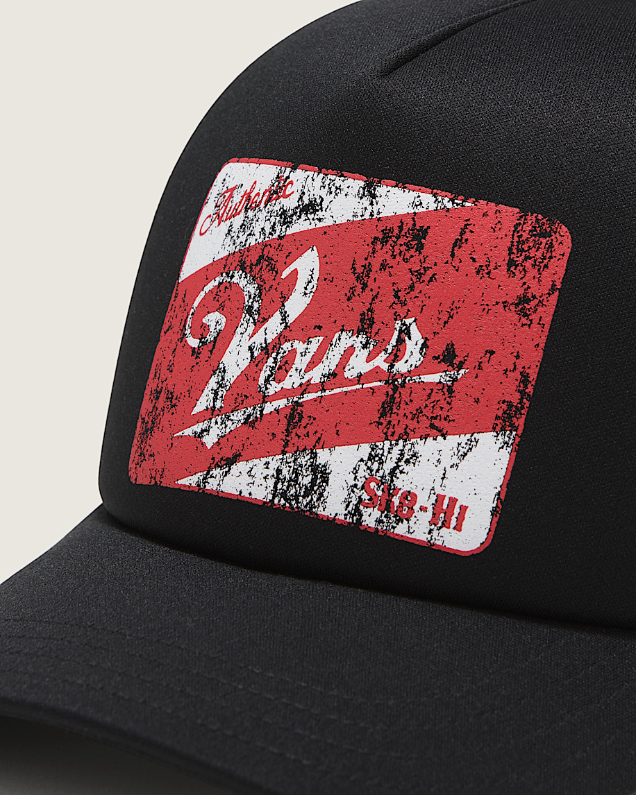Weathered and worn but oh so cool, the Vans Supply Trucker Hat is a classic trucker hat with breathable mesh backing, a curved bill, and a direct screenprinted graphic of a roughed up Vans® logo sign..