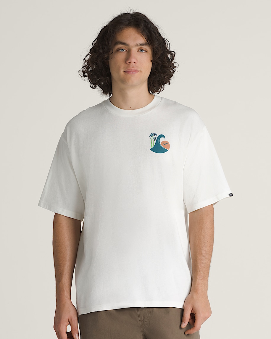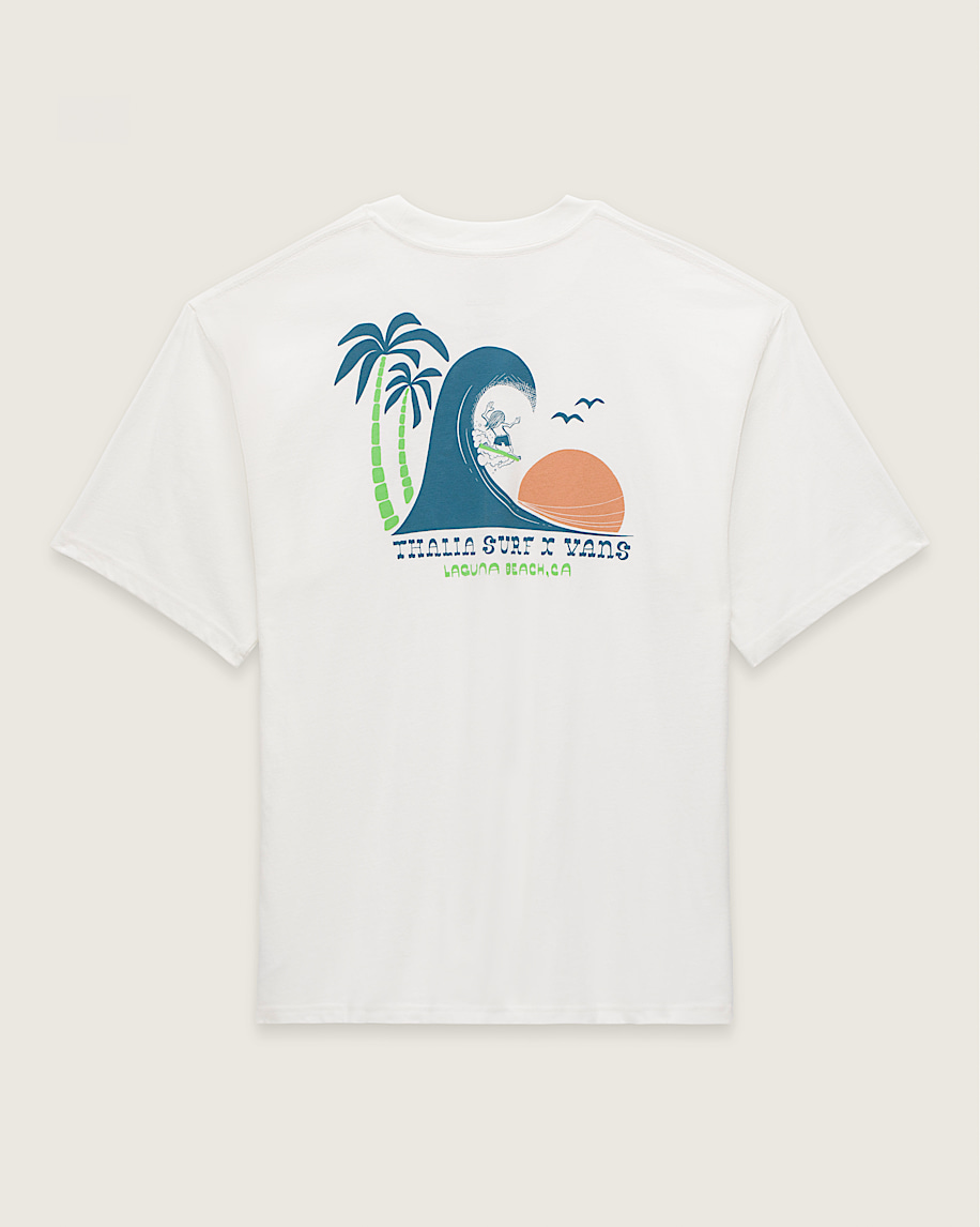 Mens short sleeve teeRibbed neckline for stuctureThalia Surf graphic at chest and backVans woven label on left sleeveLoose fit100% cotton