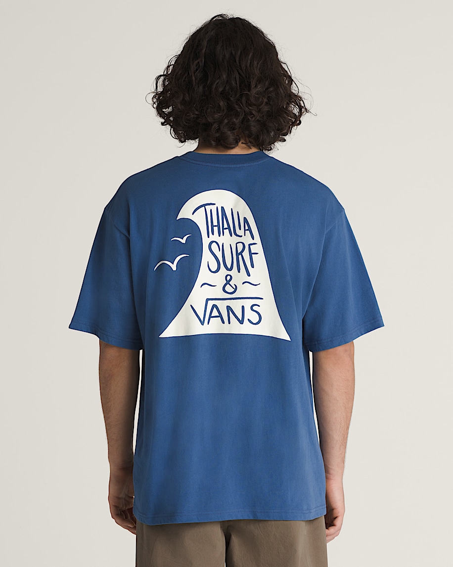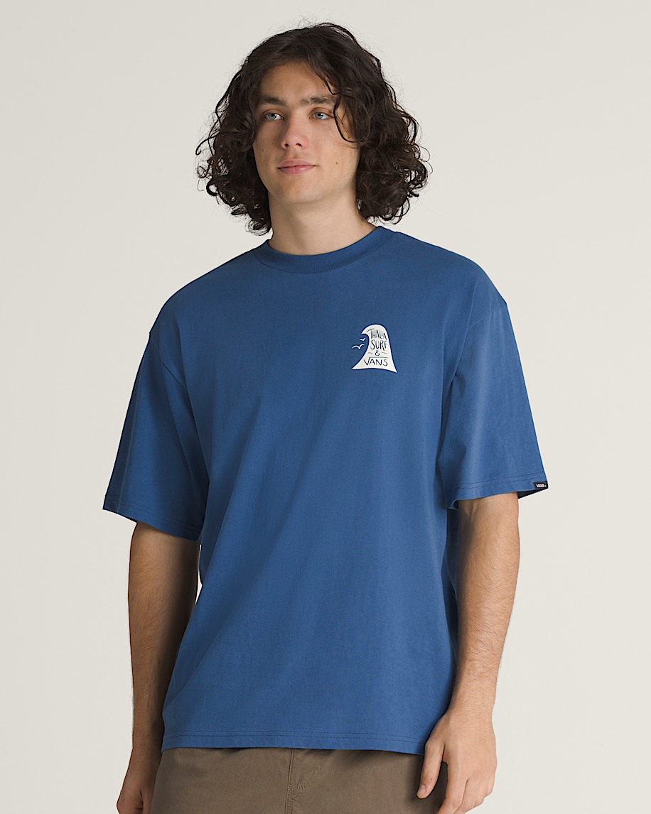 Mens short sleeve teeRibbed neckline for stuctureThalia Surf graphic at chest and backVans woven label on left sleeveLoose fit100% cotton