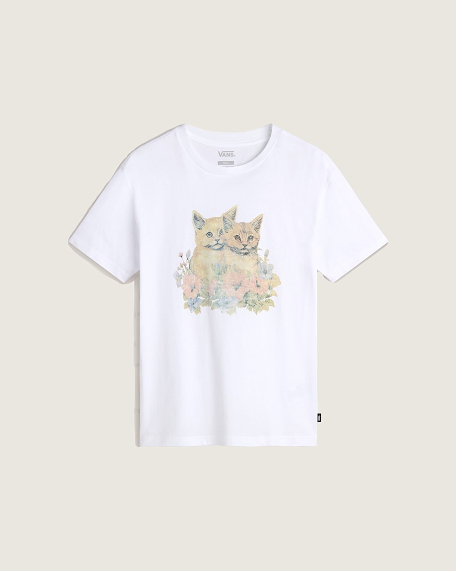 Be cuteness personified in the Vintage Smitten T-Shirt, an oversized heavy cotton jersey crew neck T-shirt. It features a graphic of kittens sitting among flowers with additional Vans® branding.