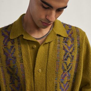 The retro button down gets a new life with the Wheeler Polo Sweater, with short sleeves for a casual, everyday style and a fuzzy knit for added coziness. Engineered jacquard artwork adds elevated visual details to either side of the button closure front,