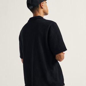 Short sleeve silhouette with camp collarFuzzy knit texture for a soft feelEngineered jacquard artwork for built-in designButton-front closure100% polyester