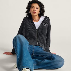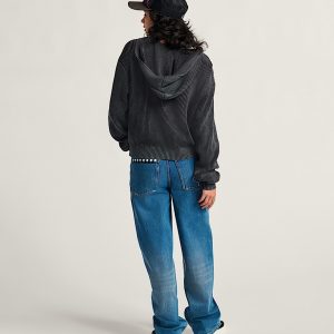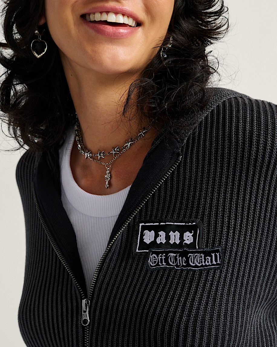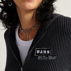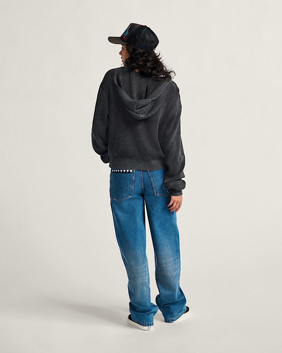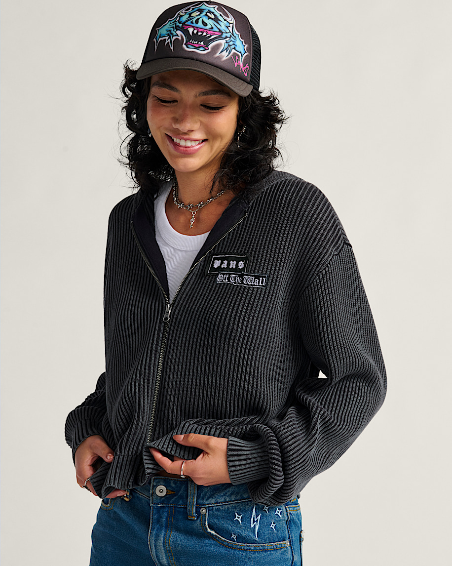 Long sleeve zip front hooded sweaterAcid wash for a weathered lookVans custom patches100% cotton